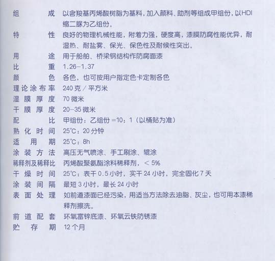 适用于电厂、冶金厂、化工厂、桥梁、钢闸门、船舶水域以上部位等各种钢结构表面以及混凝土构筑物表面作保护和装饰面漆。
