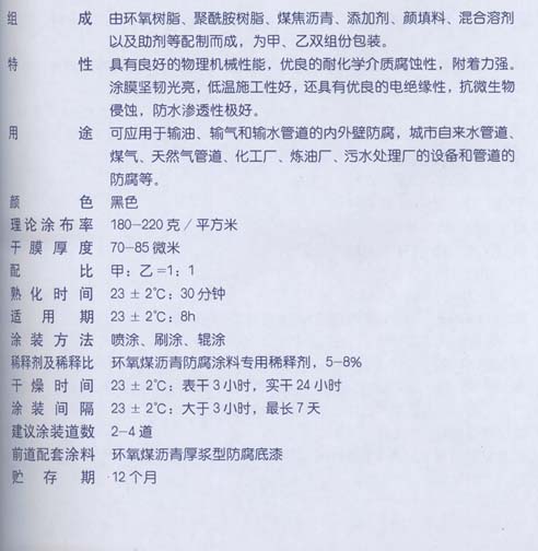 厚浆型环氧煤沥青涂料,其底漆成分及配比为:环氧树脂 15-30%蒽油 20-40%氧化铁红 20-40%锌 铬 黄 2-15%混合溶剂 5-25%其面漆成分及配比为:环氧树脂 10-35%蒽 油 10-30%煤 沥 青 10-30%滑 石 粉 5-20%云 母 粉 5-20%混合溶剂 5-20%流 平 剂 1-5%利用该发明的成分配比配制的涂料,干燥时间短、机械强度高,附着力好,耐酸、碱,常温涂刷、固化。用于泵站运行中以及管线不停输情况下防腐层更新、补伤、补漏。